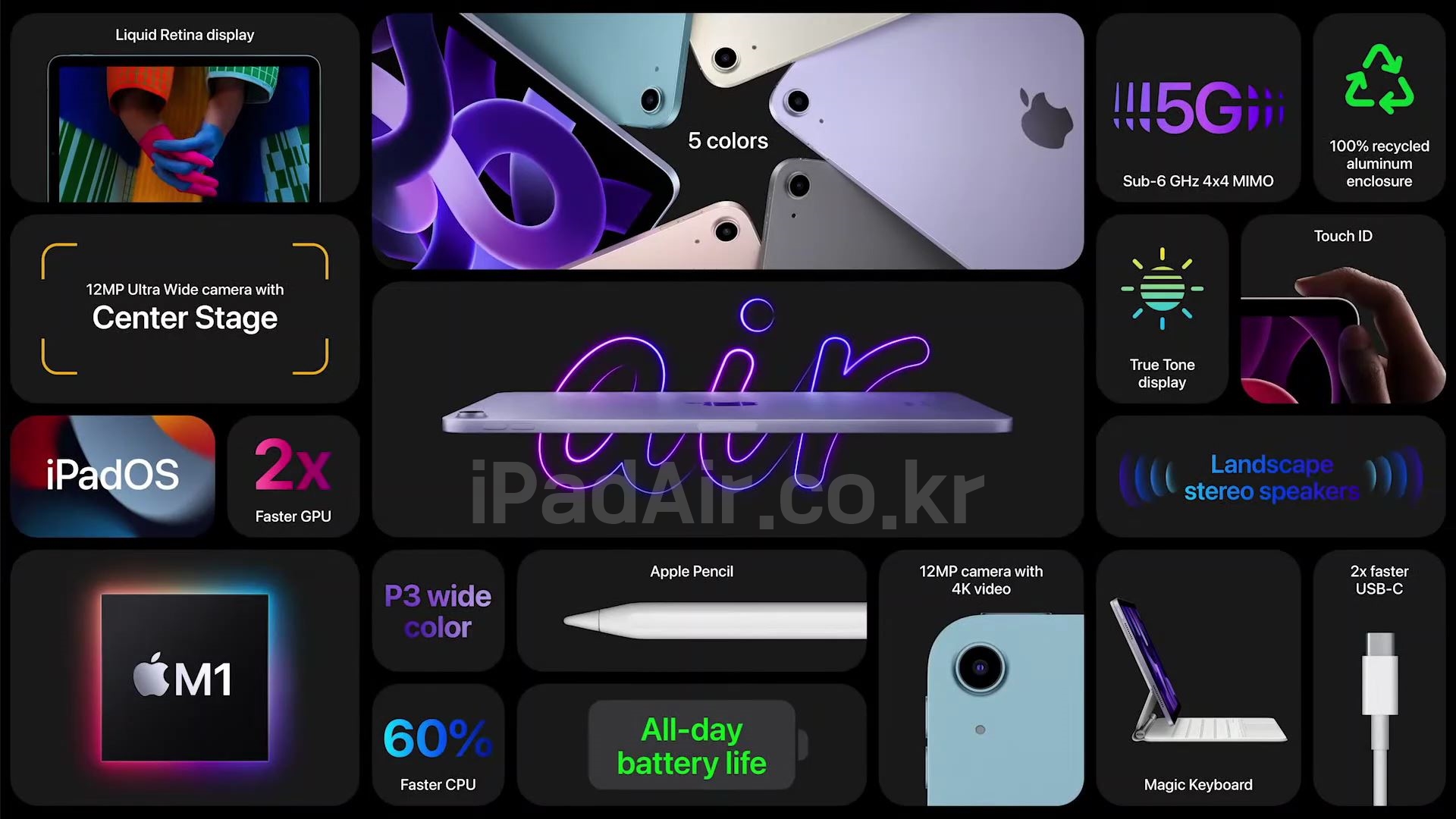이번에 새롭게 나온 아이패드 에어는 프로 모델과 동일한 M1 칩셋을 탑재하였으며, 1200만 화소 전면 카메라, 새로운 색상이 추가되었지만, 가격은 동일하게 나왔다.